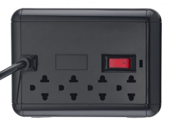 Regulador especialmente para equipos Mac, Puerto USB para carga iPhone / iPad, Regulador de Voltaje 1500VA / 750W, 4 contactos NEMA 5-15R, Suprime picos de voltaje, Regula la variación de voltaje del suministro eléctrico. Color Negro acabado piano.